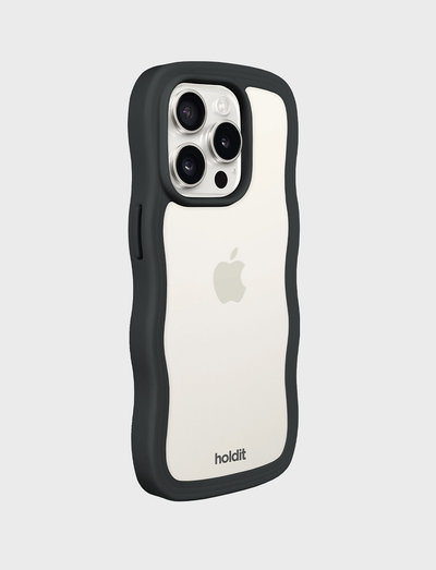 Denne telefonkasse er designet til iPhone 12 og 12 Pro. Den har et bølget design med en klar bagside og en sort ramme. Kassen er lavet af holdbart materiale og giver beskyttelse til din telefon.