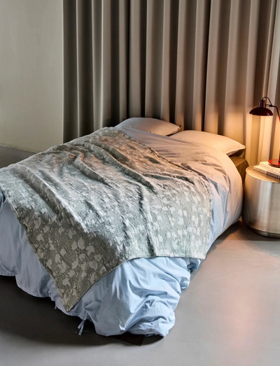 Sengetæppet HDMori er vævet i blød bomuld og prydet med et jacquardmønster i råhvid og khaki, der tilfører soveværelset et roligt og elegant udtryk.