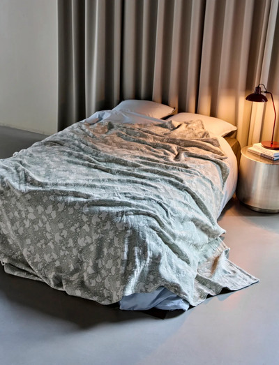 Sengetæppet HDMori er vævet i blød bomuld og prydet med et jacquardmønster i råhvid og khaki, der tilfører soveværelset et roligt og elegant udtryk.