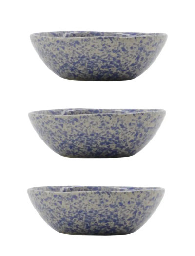 Med dette håndlavede sæt skåle får du en unik kombination af råhvid keramik og blåt stænkmønster, som giver borddækningen energi og personlighed. Hver skål har en blød, ujævn form, der skaber en hyggelig og levende stemning – de er perfekte til snacks, morgenmad eller små serveringer. Sæt dem sammen med ensfarvet service for at skabe et roligt look, eller kombiner dem med flere farver for at opnå et mere sprælsk udtryk.