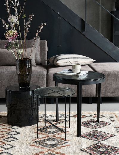Dette sidebord ved navn tamu viser, at mindre nogle gange er mere. den tykke, riflede glasplade hviler på et slankt jernstel med bøjler og giver en følelse af lethed og et minimalistisk udtryk i din stue. placer tamu ved siden af din sofa, brug det som sidebord til din lænestol eller som konsol i et hjørne. for at få et markant alternativ til et sofabord kan du kombinere det med andre sideborde med sort som det vigtigste element.