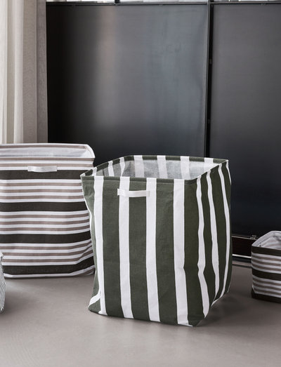 Den store opbevaringskurv fra house doctor er nem at bruge og passer ind overalt i dit hjem. stoffet er robust nok til at få kurven til at stå af sig selv, men let nok til at kunne foldes sammen for nem opbevaring og for at spare plads, når den ikke er i brug. med de brede, grønne striber er denne opbevaringskurv en afslappet tilføjelse til din reol eller skabshylder. for at gøre designet til en del af din indretning skal du placere kurven på gulvet, fyldt med plaider eller dine strikkeartikler. når den er foldet ud, kan der stadig forekomme naturlige folder i stoffet. dette betragtes som en del af designet.