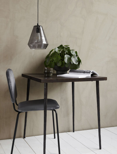 Slated er et smukt spisebord til to fra house doctor. det har en bordplade i sortbejdset mangotræ kombineret med rå jernben - et design, der skaber en personlig og varm atmosfære i hjemmet. de rå metalben giver bordet et industrielt twist. perfekt som spisebord i et mindre køkken eller som cafébord. bordet fås også i en lysere version, der ikke er blevet bejdset.