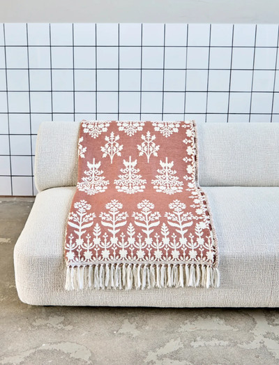 - Varm terracotta-brun farve med off-white folklore-inspireret mønster.
