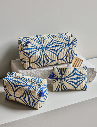 HDCare-sættet består af 3 toilettasker i forskellige størrelser, fremstillet i off-white bomuld med et karakteristisk blåt mønster. De dekorative kvaster på lynlåsen tilføjer et elegant touch.