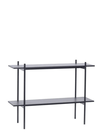 Norm-hylde med to overflader i mørkt træ og sort metal.