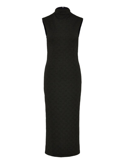 Denne midikjole er defineret af et ærmeløst design, der giver en strømlinet silhuet. Den høje halsudskæring tilføjer et sofistikeret touch, hvilket gør den velegnet til aftenarrangementer.