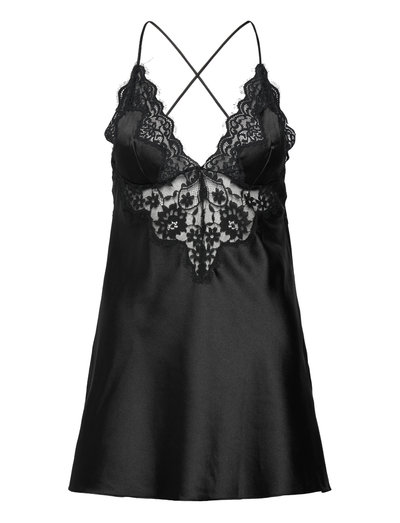 Denne natkjole er fremstillet af glat satin og har fine blondedetaljer ved halsudskæringen. Cami-stropperne krydser på ryggen, hvilket tilføjer et elegant touch til dette behagelige nattøj.