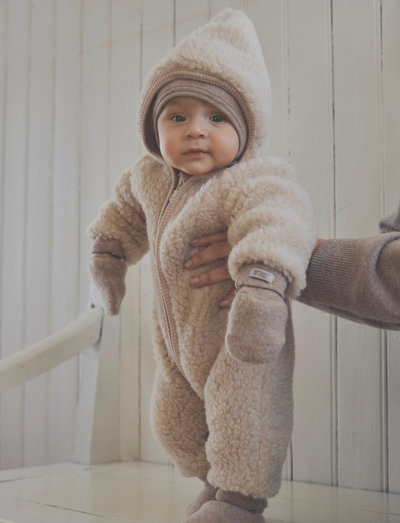 Smart, warm HUTTEliHUT all-in-one suit made of wool teddy. The HUTTEliHUT suit has a fixed pointed hood with a pompom on top and a pointed shape. All openings have ribbed edges. The suit opens at the front with a hidden zipper and chin guard. It is made of Merino wool. This product is made of wool, known for its durability if cared properly: Wash it only when necessary. Select a gentle wool detergent. Do not use fabric softener. Always choose the gentle wool machine-wash cycle, turning the garment inside out. Use a low spin cycle. Reshape while wet. For hand washing, use lukewarm water and avoid wringing, gently press with a towel to remove excess water. Lay flat on a towel to dry - do not place on a radiator or in a tumble dryer.