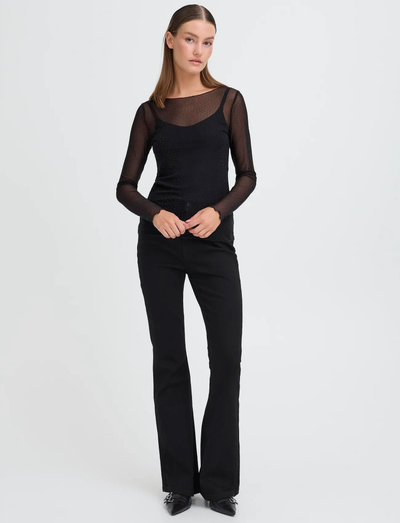 Denne langærmede top er fremstillet i et let, halvgennemsigtigt materiale, der giver en delikat og luftig fornemmelse. Den subtile tekstur tilføjer et strejf af visuel interesse, mens den tætte pasform gør den ideel til lagdeling eller til at bære alene.