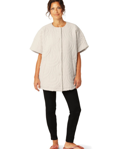 Syntetisk foringDenne quiltede cape giver både komfort og et strejf af elegance. Den er designet med en rund hals og blød vattering, og giver varme og stil. Den har også paspolerede sidelommer og en skjult trykknaplukning dækket af stof. Den let oversized pasform gør den perfekt til lag-på-lag, mens det unikke broderimønster tilføjer en eksklusiv detalje.