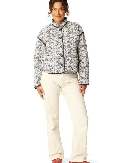 Denne korte, boxy quiltjakke har en blød, syet vattering, der giver en behagelig og stilfuld pasform. Designet omfatter en lille mandarin-krave, kontrastfarvet kantebånd ved alle sømme, skjulte forlommer og hornknapper med logo foran.