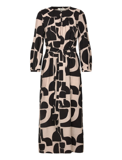 Denne maxikjole har et taljebælte, der giver en flatterende silhuet. Det flydende design fremhæves af lange ærmer og et grafisk all-over-print, hvilket gør den til et stilfuldt valg til forskellige lejligheder.