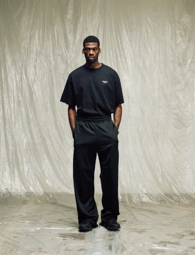 Oplev ubesværet stil og komfort hele dagen med disse track pants med brede ben. De er fremstillet af en polyesterblanding af høj kvalitet og giver en glat fornemmelse og flydende bevægelse. Den elastiske snøre i taljen sikrer en tilpasset pasform, mens de rene sømme skaber et minimalt, afslappet look, der problemfrit kan bruges både på gaden og derhjemme.