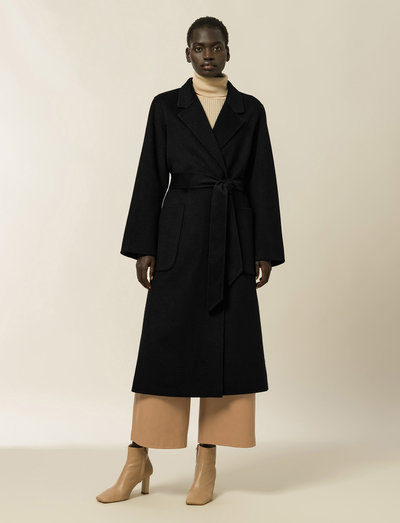 Denne stilfulde dobbeltsidede frakke er lavet af ren uld og har et klassisk design med en bæltet talje. Den har en løs pasform og er ufor foret for en let følelse. Frakken har to lommer med klapper og en klassisk krave.