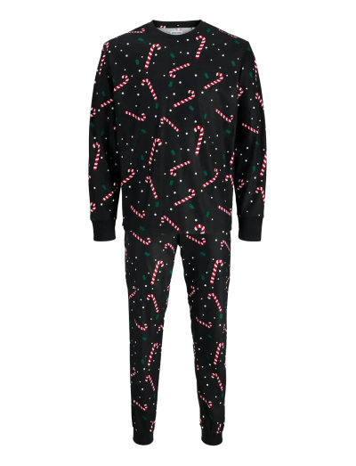 Dette loungesæt har et festligt mønster og er perfekt til afslapning med stil. Det bløde jerseystof sikrer en behagelig pasform, mens de ribbede manchetter tilføjer et ekstra touch. Sættet er designet til fritid og inkluderer en langærmet overdel med O-hals og matchende underdele.