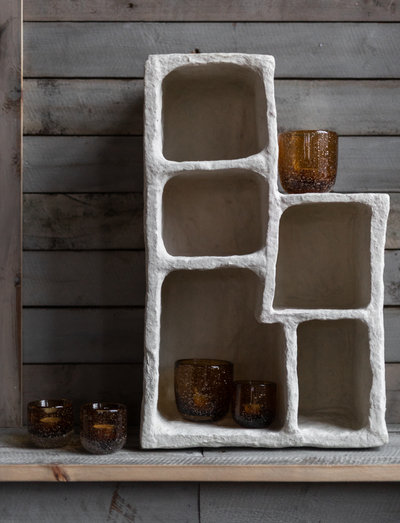 Lad dit hjem blive dekoreret med papier-hylden. med sit karakteristiske og skulpturelle design vil papier sprede inspiration til sine omgivelser og er et ægte blikfang. dekorer den med detaljer eller lad den stå, som den er, den er lige smuk uanset hvad. da produktet er lavet af papiermaché, tåler det ikke vand og rengøres med en tør klud.