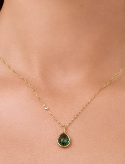 Denne halskæde har en fængslende pæreformet briolette-krystal, indrammet i en fyldig, gylden nuance. Den rosenslebne krystal fanger lyset ved hver bevægelse og skaber en blændende effekt. Den er fremstillet af 22 karat forgyldt 925 sterlingsølv med en satinfinish, og udstråler elegance. Sæt den sammen med matchende øreringe eller andre vedhæng for et komplet look.