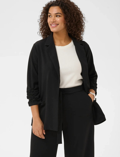 Denne blazer har et trekvartærme med en rynket manchet, der giver et moderne twist til en klassisk silhuet. Det åbne design og den afslappede pasform gør den nem at bruge som et lag.