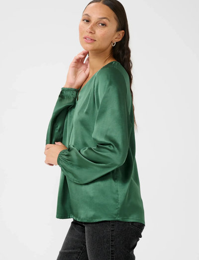 Denne langærmede bluse er designet med en V-udskæring og tilføjer et sofistikeret touch til ethvert outfit. Den almindelige pasform sikrer en behagelig og flatterende silhuet, hvilket gør den til en alsidig tilføjelse til din garderobe.