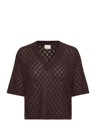Denne V-hals pullover har en delikat, åben strik, der giver en afslappet og luftig fornemmelse. De korte ærmer og den subtile tekstur gør den til et alsidigt stykke tøj, der kan bruges lagvis eller alene.