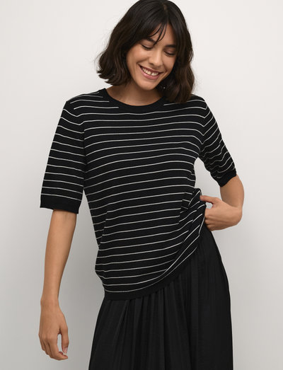 Horisontale striber definerer denne strikkede hverdagspullover. Den er designet med en rund hals og ærmer, der er skåret over albuen, og har en almindelig pasform og en blød, tæt strik. Ribkanter fuldender looket, og sømmen sidder ved hofterne.