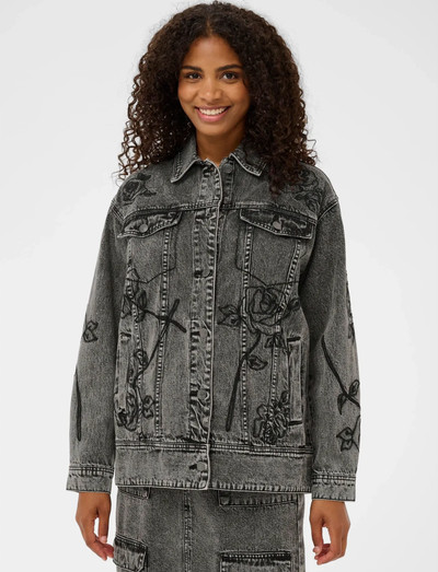 Markante blomsterbroderier løfter denne klassiske denimjakke. Designet har knaplukning foran, brystlommer og en struktureret krave, hvilket giver en blanding af traditionel stil og iøjnefaldende detaljer.