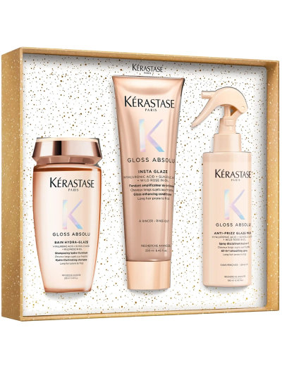Indfang årstidens magi med Kérastase. Dette Kérastase Holiday Set til langt hår med tendens til krus inkluderer tre produkter: Gloss Absolu Bain Hydra-Glaze Shampoo, Gloss Absolu Insta Glaze Conditioner & Gloss Absolu Anti-Frizz Glaze Milk. Bain Hydra-Glaze fra Kérastase er en hydra-illuminerende shampoo til langt hår med tendens til krus. Den indeholder hyaluronsyre, glykolsyre og vildroseolie for at give fortryllende, bouncy og glansfuldt hår. Insta Glaze fra Kérastase er en glansgivende balsam til langt hår med tendens til krus. Den er indeholder hyaluronsyre, glykolsyre og vildroseolie for at give fortryllende, bouncy og glansfuldt hår. Anti-Frizz Glaze Milk fra Kérastase er en alt-i-en smoothing spray til langt hår med tendens til krus. Den indeholder hyaluronsyre, glykolsyre og vildroseolie for at give fortryllende, bouncy og glansfuldt hår.