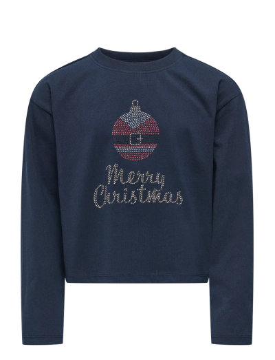 Festlig langærmet top med et juleinspireret motiv. Denne strikkede T-shirt har en klassisk rund hals og en behagelig pasform, perfekt til juletiden.