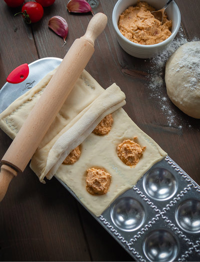 Raviolibrættet er perfekt til at lave lækre ravioli. Du lægger en strimmel melet dej på brættet og trykker dejen ned i fordybningerne, hvor fyldet så placeres. Pensl pastakanterne med lidt sammenpisket æggeblomme, så pastakanterne holder godt sammen. Læg derefter det andet ark dej ovenpå, og rul den medfølgende dejrulle hen over formen, som står sikkert på skridsikre gummifødder. Raviolierne er nu lukkede og kan forsigtigt tages ud af formen.