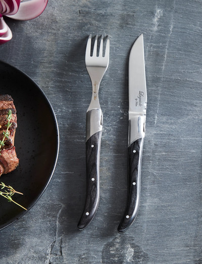 Steak knives and forks Laguiole is neither a trademark nor a company name, Laguiole is a name that is associated with the special shape that the traditional knives have. It dates back to the 19th century. Laguiole originate from the Massif Central in France from the small village of Laguiole - hence the name. Steak knives and forks with handles made of Ebony, and 420 Stainless steel with a cicada logo. Delivered in a black wooden box.