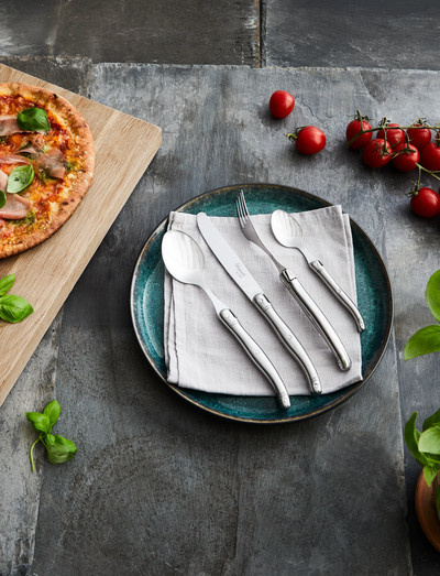 Stainless Steel Cutlery set Laguiole is neither a trademark nor a company name, Laguiole is a name that is associated with the special shape that the traditional knives have. It dates back to the 19th century. Laguiole originate from the Massif Central in France from the small village of Laguiole - hence the name. The cutlery set consists of 24 pieces, including dinner spoons, teaspoons, knives, and forks. The handles are made of stainless steel, and the blades are made of 420 stainless steel, marked with a cicada logo.