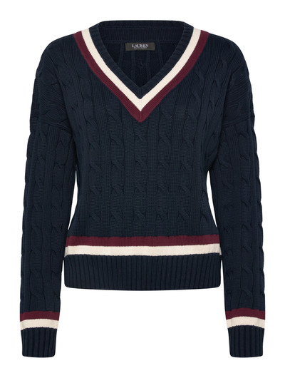 Denne bomuldsstrik har et klassisk kabelstrikdesign og tilbyder både komfort og tidløs stil. V-udskæringen er afsluttet med sporty striber, der supplerer den ribbede kant forneden og manchetterne.