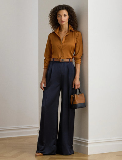 Embellished with signature engraved buttons, this timeless shirt is crafted with glossy satin charmeuse for a luxurious Lauren look.Straight fit. Intended to hit at the hip.Size medium has a 27.5" body length and a 32.5" sleeve length. Body length and sleeve length are taken from the center back of the neck. Sleeve length changes 0.75" between sizes.Point collar. Buttoned placket. "Lauren Ralph Lauren"–engraved pearlized buttons.