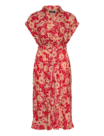 Med et blomsterprint over det hele giver denne crepekjole en flatterende silhuet med sit bælte i taljen. Wrap-designet og den knælange pasform gør den til et alsidigt valg til forskellige lejligheder.