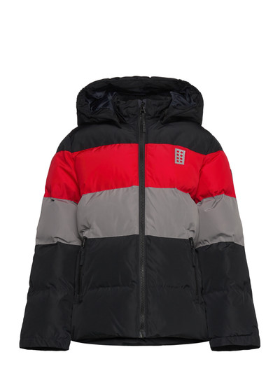 LEGO® vinterjakke til drenge og pigerHold dine børn varme og tørre med denne stilfulde LEGO® dynejakke, der kombinerer funktionalitet og et klassisk design. Jakken er perfekt til både drenge og piger og er udstyret med en række praktiske funktioner, der gør den ideel til udendørs leg i al slags vejr. Vandsøjletrykket på 3.000 mm beskytter mod regn og sne Med BIONIC-FINISH ECO® imprægnering, der giver vandafvisende beskyttelse mod regn og snavs Flot stribet design Den aftagelige hætte er monteret på et unikt trykknapbånd YKK-lynlåsen foran har vindstolpe under, så jakken er helt vindtæt 3M refleksbadgen er formet som en LEGO klods og giver øget synlighed i mørke Praktiske lynlåslommer foran til opbevaring af uundværlige småtingHætten er aftagelig af sikkerhedsmæssige årsager. Den er nemlig monteret på et særligt trykknapbånd, og hvis man hiver i hætten, løsner den sig fra jakken. På den måde mindskes risikoen for uheld, hvor børn hænger fast i noget med hætten. Jakken er lavet af polyester med syntetisk dunfyld, der sikrer varme og komfort. Takket være elastikken i hættens kant og ribmanchetterne i ærmeenderne er denne jakke både funktionel og stilfuld - perfekt til aktive børn.Specifikationer• 3M refleksbadge.