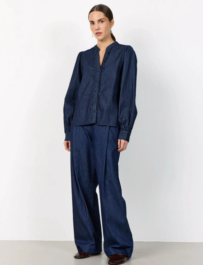 Denne denimskjorte har en knaplukning foran, der er indrammet af en delikat flæsekant. De lange ærmer og bandkraven tilføjer et strejf af elegance til denne alsidige style.