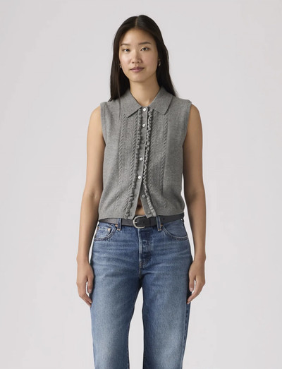 Denne strikkede vest har en charmerende flæsedetalje ned foran, der tilføjer et strejf af tekstur og visuel interesse. Den kraveløse halsudskæring giver et sofistikeret præg, hvilket gør den til et alsidigt stykke tøj til lagdeling eller brug alene.
