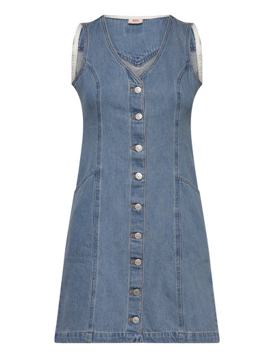 Denne ærmeløse kjole er fremstillet i klassisk denim og har en knaplukning foran. V-halsdesignet og panelerne skaber en flatterende silhuet. En alsidig beklædningsgenstand, der kan dresses op eller ned.