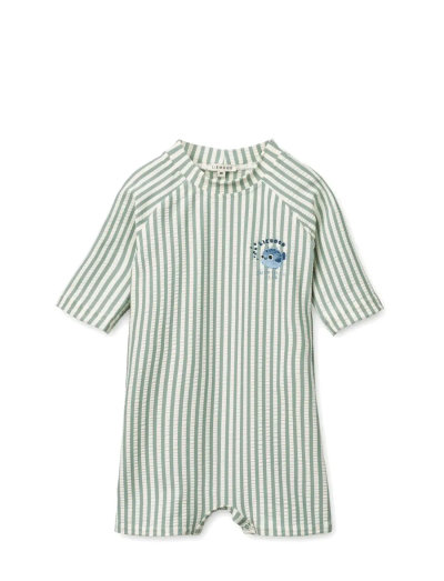 Denne kortærmede badedragt til babyer har UV40+ beskyttelse og er fremstillet i et strækbart og hurtigtørrende seersucker-stof. Den indeholder 54% GRS-certificeret genanvendt polyester og har trykknapper i bunden, som gør det nemt at skifte ble. Komfortabelt badetøj til din babys første oplevelser ved vandet.