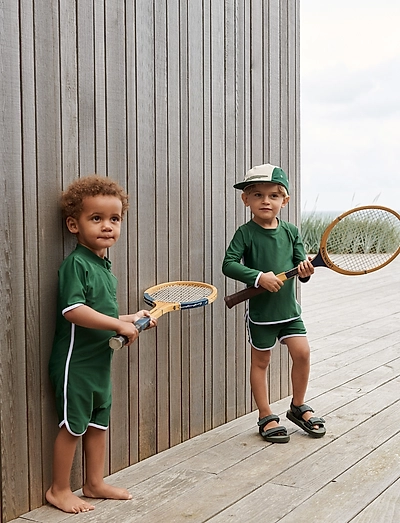 Denne badedragt er fremstillet af genanvendt polyester og giver beskyttelse og komfort på solrige dage. Den har korte ærmer og en høj krave, der giver ekstra dækning.