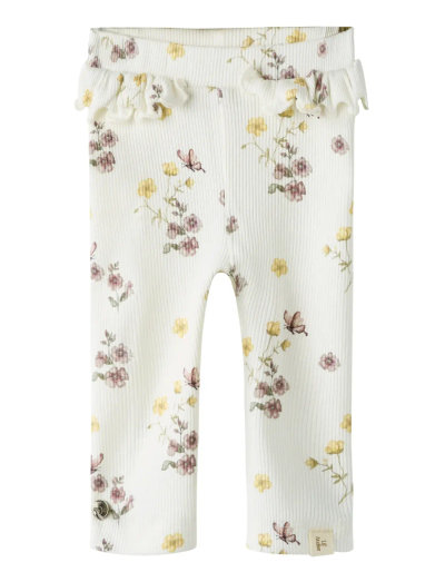 Disse leggings er et stilfuldt og komfortabelt valg til småbørn. De har et blødt, rib-stof med et fint blomsterprint. Den elastiske talje sikrer en behagelig pasform, mens rynkedetaljen i taljen tilføjer et strejf af sødme.