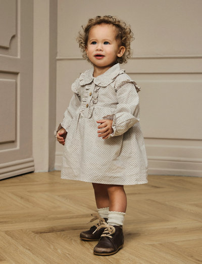 Denne bodykjole er en charmerende tilføjelse til ethvert barns garderobe, med et let tekstureret vævet stof med et tydeligt krydsmønster. Den har lange ærmer med elastiske manchetter, en grandad-hals og både knap- og trykknaplukning for nem påklædning. Flæsedetaljer og etiket tilføjer ekstra flair.
