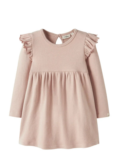 Denne kjole er fremstillet i blød jersey og giver dit barn en behagelig fornemmelse og masser af bevægelsesfrihed. Den har lange ærmer, en klassisk O-hals og flæsedetaljer ved skuldrene. Den er afsluttet med en knaplukning bagpå.