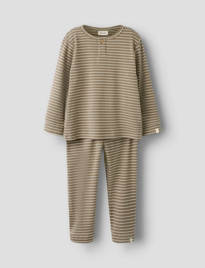 Dette bløde pyjamasæt har et legende allover-print, der sikrer en behagelig nattesøvn. Det lette jerseystof giver en blød fornemmelse og ubegrænset bevægelsesfrihed. Den langærmede overdel har knaplukning, mens underdelen har justerbar talje for perfekt pasform. En etiket tilføjer en diskret detalje.