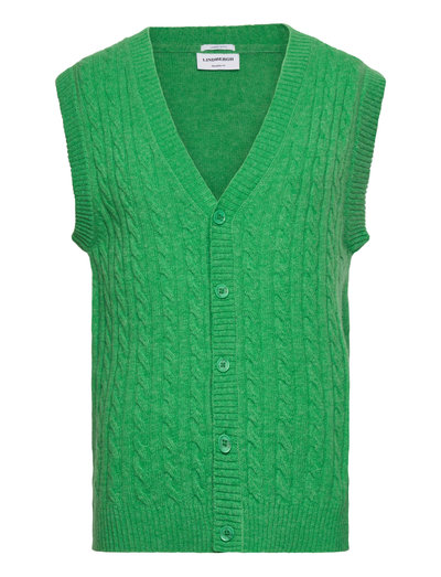 Denne knap slipover er fremstillet af blød lammeuld og giver et behageligt og stilfuldt lag. Kabelstrikdesignet tilføjer et strejf af klassisk tekstur, mens den ærmeløse udskæring gør den ideel til overgangsvejr.