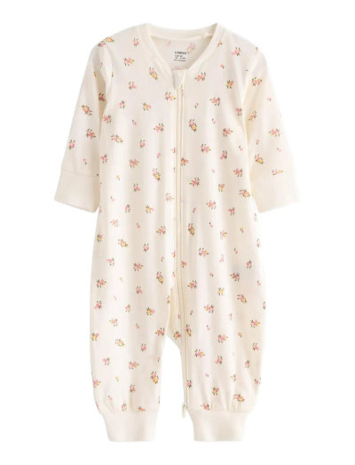 Denne pyjamasdragt med lange ærmer er fremstillet i blød bomuld og sikrer en behagelig nats søvn. Designet har en praktisk tovejslynlås, der gør bleskift meget nemmere. Dragten er udsmykket med et delikat blomstermønster.