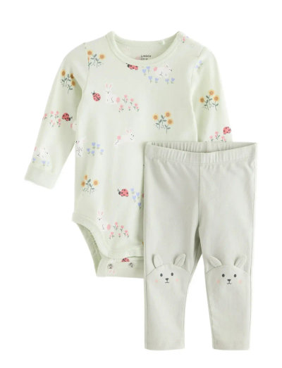 Dette sæt har et legende print og inkluderer en blød body og matchende leggings. Bodyen har trykknapper, der gør det nemt at skifte, mens leggingsene har søde kanindetaljer ved knæene.