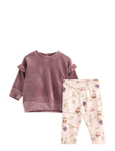 Dette bløde sæt i to dele består af en velour-jumper med fine flæsedetaljer ved skuldrene. Sættet inkluderer leggings med en børstet inderside for ekstra komfort og et legende print.