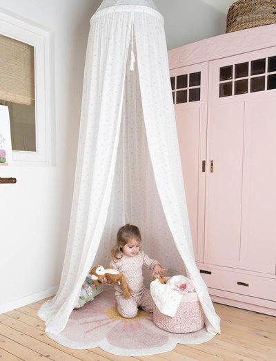 Skab et hyggeligt legeområde med denne udsøgte baldakin. Hvis du hænger den op i rummet, vil det øjeblikkeligt løfte stemningen. Placer baldakinen over en blød legemåtte eller et tæppe for at forvandle rummet til et legetelt, der er perfekt til eventyr. Med Fairy Blossom-designet transporterer baldakinen dit barn til Fairy Garden med sin bløde hvide bund, der er prydet med små lyserøde blomster i fuldt flor. Det er den ideelle tilføjelse til et børneværelse og giver et hyggeligt hjørne til leg eller stille læsning.